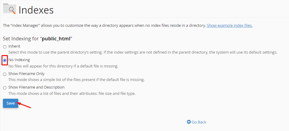 You can easily disable directory listing by opening your cPanel account and navigating to Indexes section: